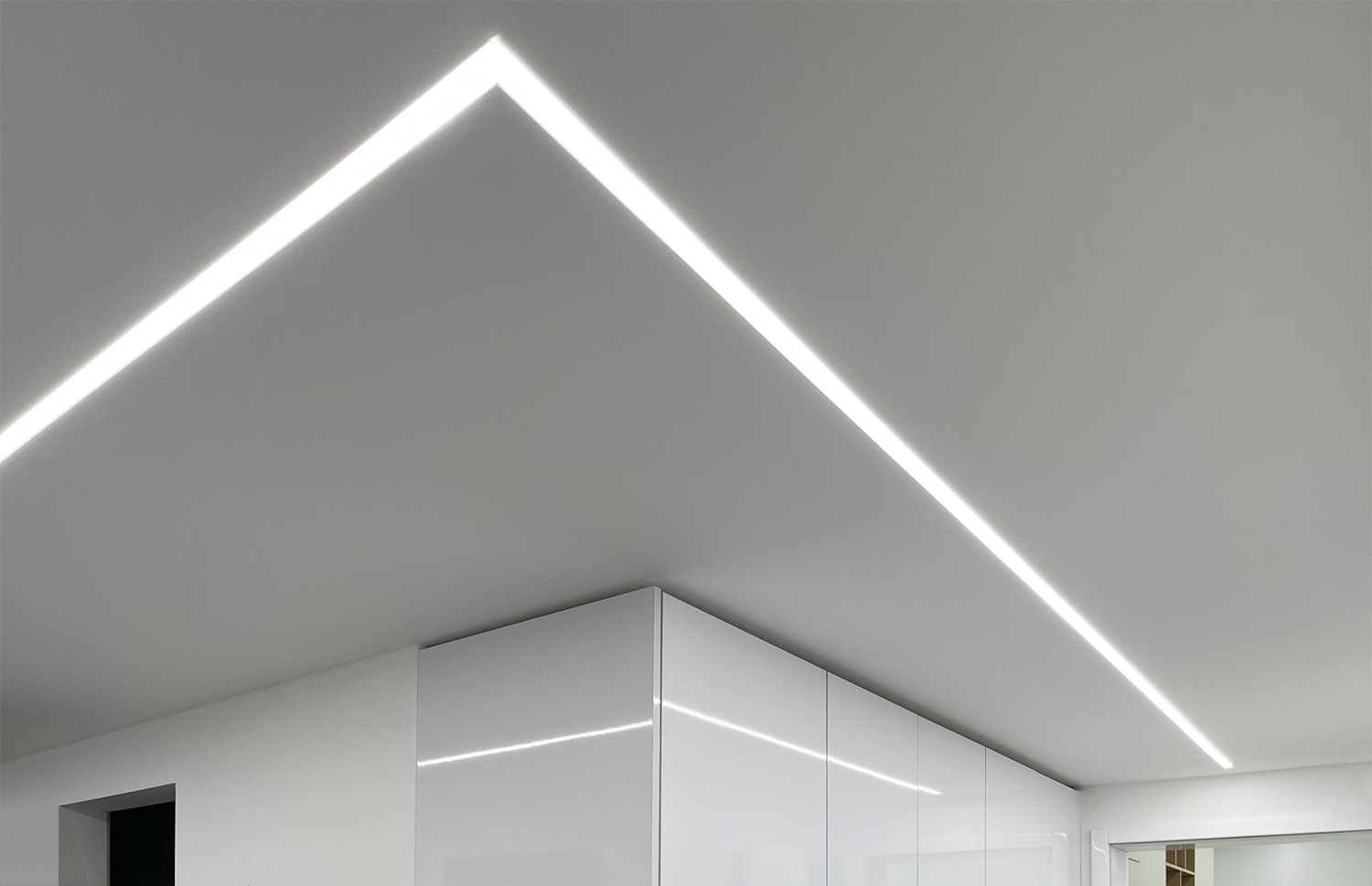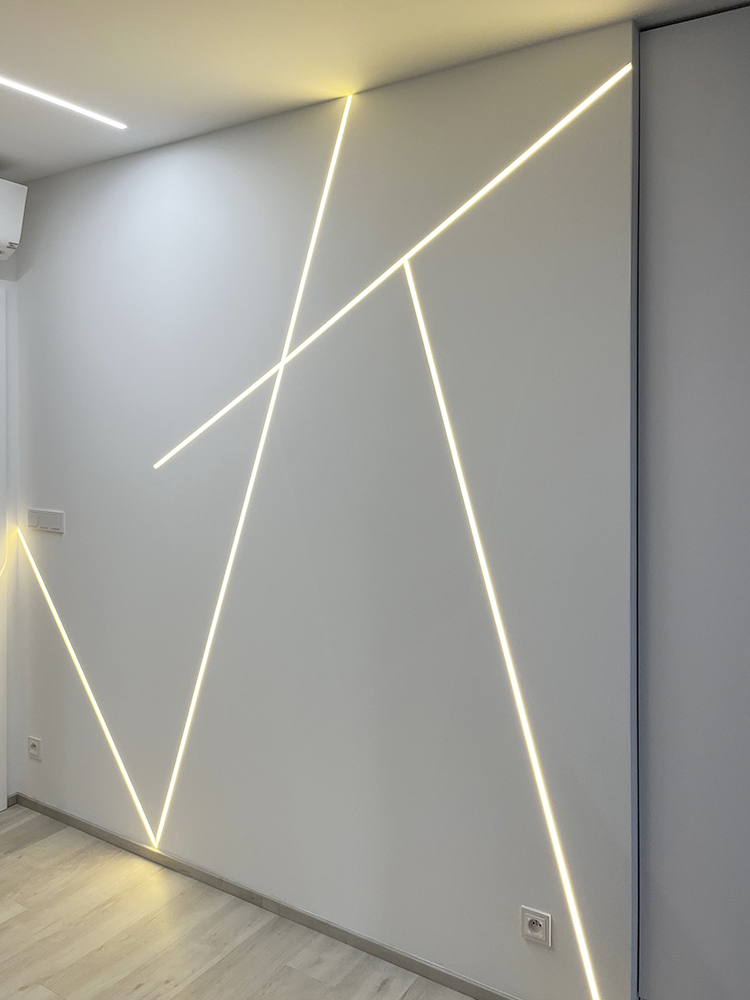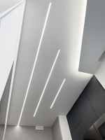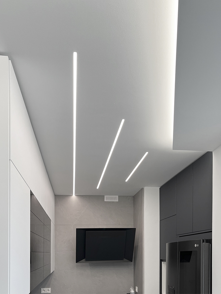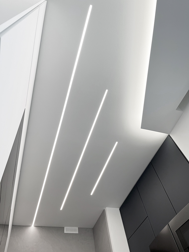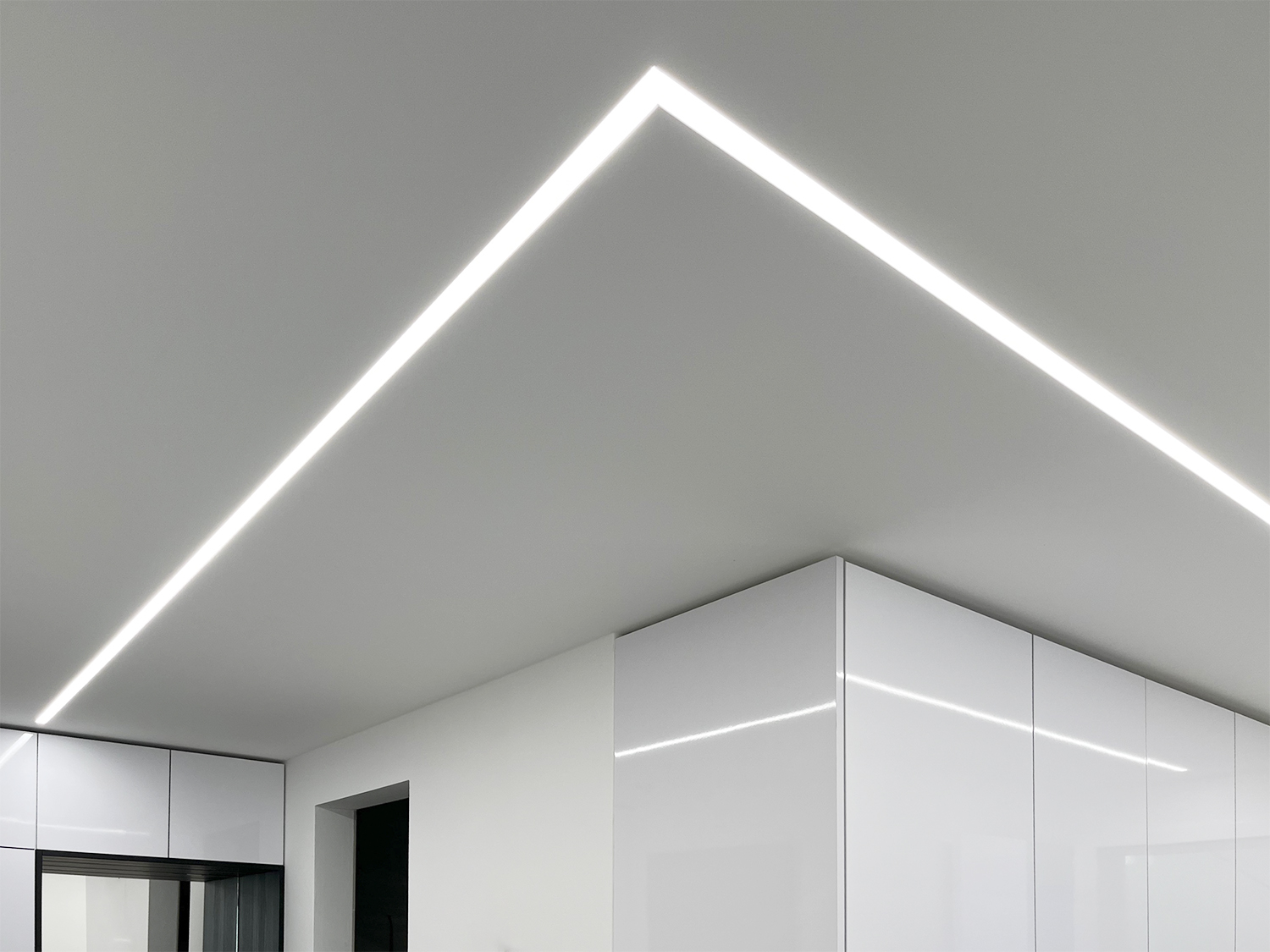 In diesem Neubau war das Ziel, einen modernen, funktionstüchtigen und ästhetisch ansprechenden Raum zu schaffen, in dem das Licht eine der Hauptrollen spielt. Die Linearleuchten, die in die Decke und die abgehängte Trockenbaudecke installiert wurden, wurden mithilfe der LED-Profile KLUŚ KOZEL und KLUŚ PDS-T geschaffen. Für die Lichtlinien in den Wänden wurde das LED-Profil KLUŚ KOZMA verwendet. So wurde eine moderne und zeitlose Optik geschaffen.