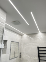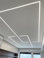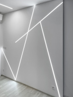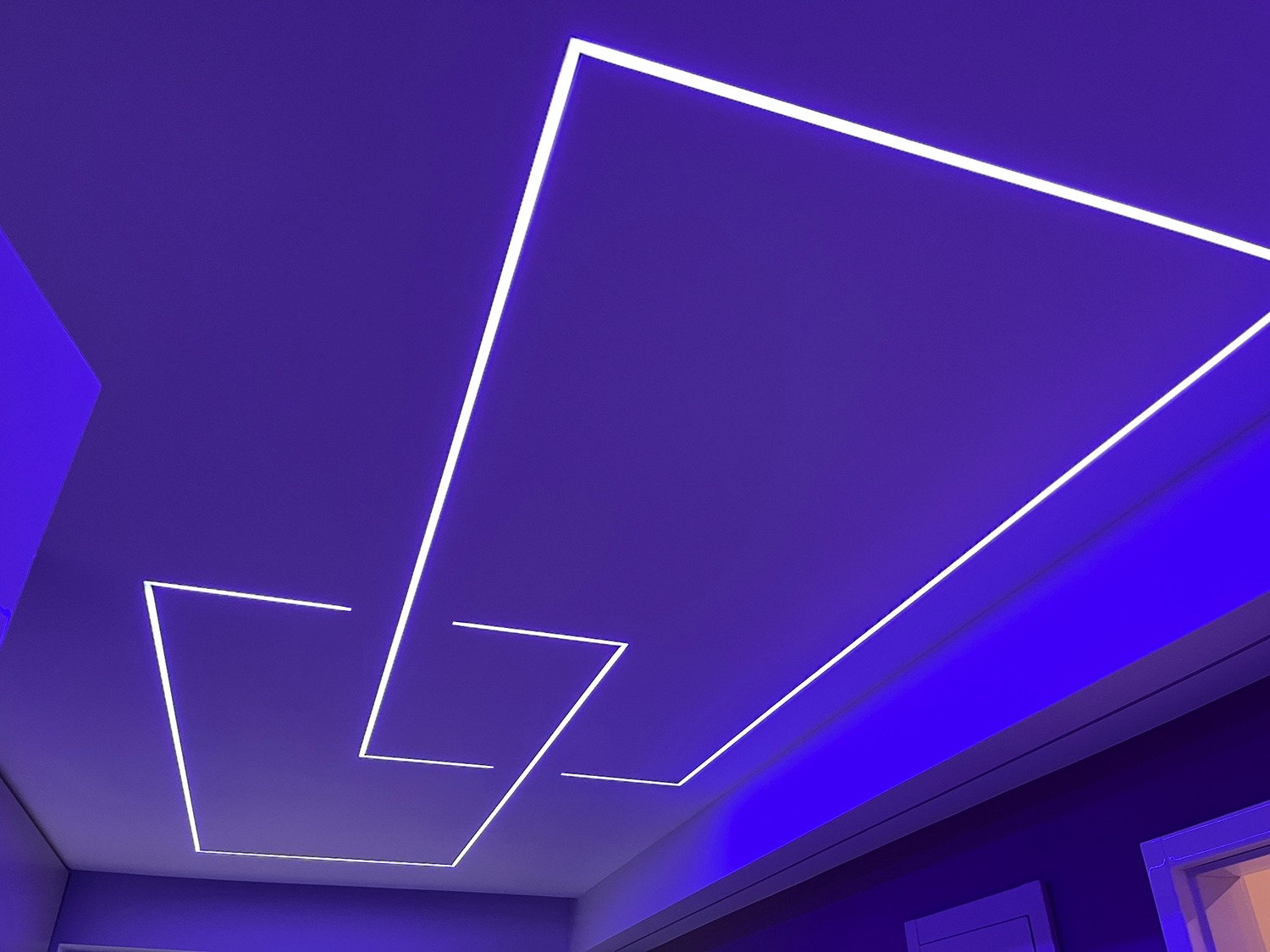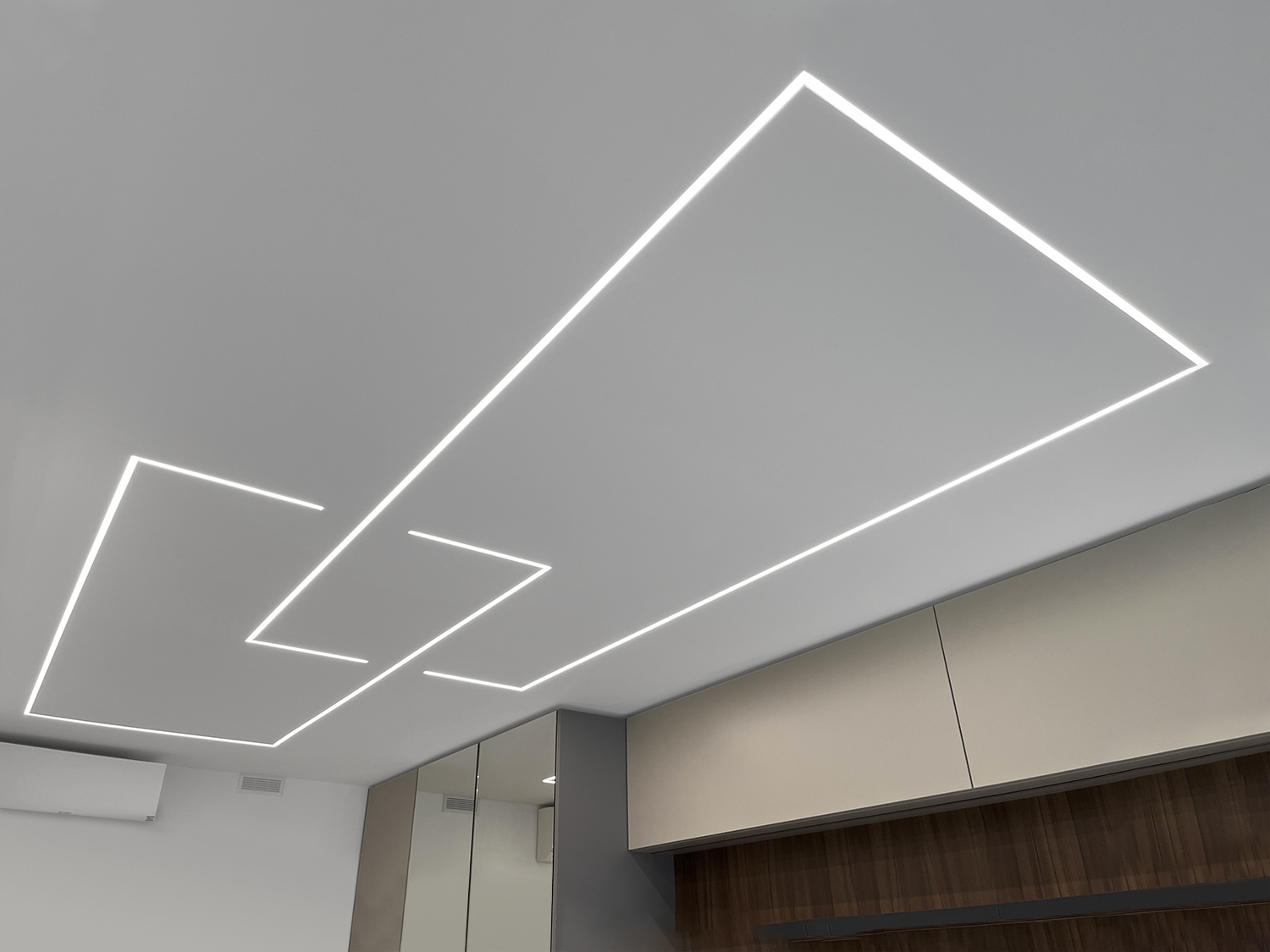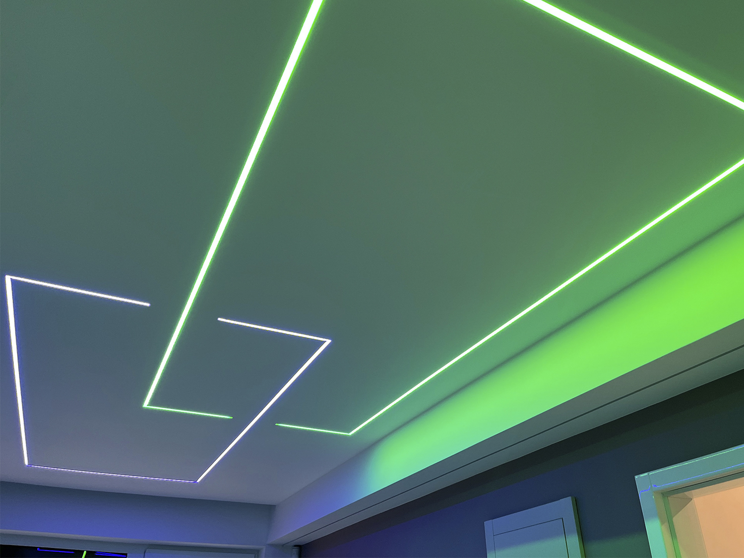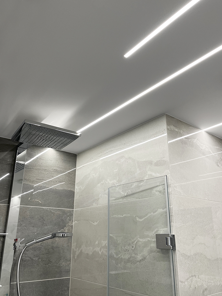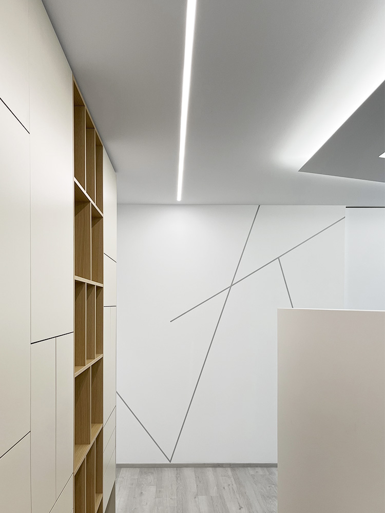In diesem Neubau war das Ziel, einen modernen, funktionstüchtigen und ästhetisch ansprechenden Raum zu schaffen, in dem das Licht eine der Hauptrollen spielt. Die Linearleuchten, die in die Decke und die abgehängte Trockenbaudecke installiert wurden, wurden mithilfe der LED-Profile KLUŚ KOZEL und KLUŚ PDS-T geschaffen. Für die Lichtlinien in den Wänden wurde das LED-Profil KLUŚ KOZMA verwendet. So wurde eine moderne und zeitlose Optik geschaffen.