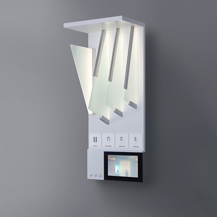 - Videopräsentation - die Tafel ist mit einem Tablet ausgestattet, auf dem eine Videopräsentation des Produkts aufgezeichnet wird.
