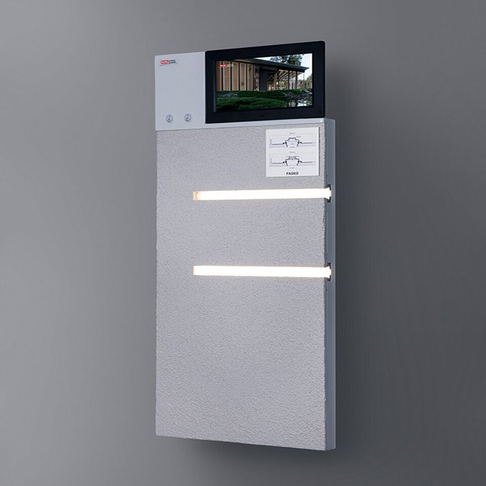 - Videopräsentation - die Tafel ist mit einem Tablet ausgestattet, auf dem eine Videopräsentation des Produkts aufgezeichnet wird.
