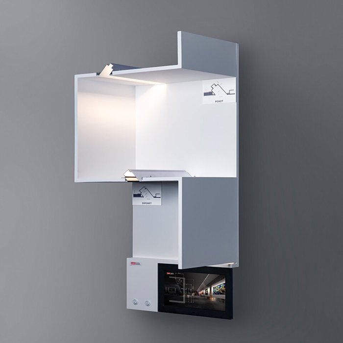 - Produktbeleuchtung (3000K LED-Streifen sind in den Profilen installiert) + die Tafel enthält die gesamte notwendige Elektronik.