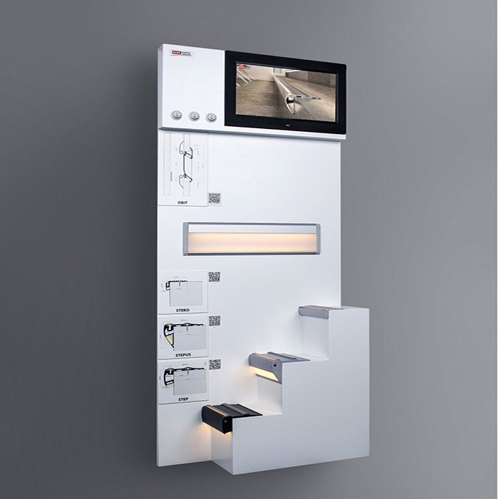 - Videopräsentation - die Tafel ist mit einem Tablet ausgestattet, auf dem eine Videopräsentation des Produkts aufgezeichnet wird.