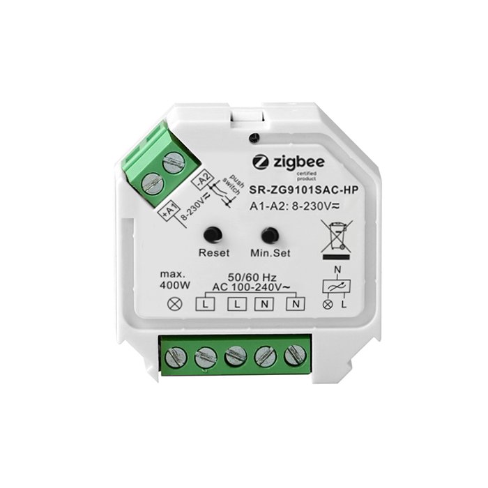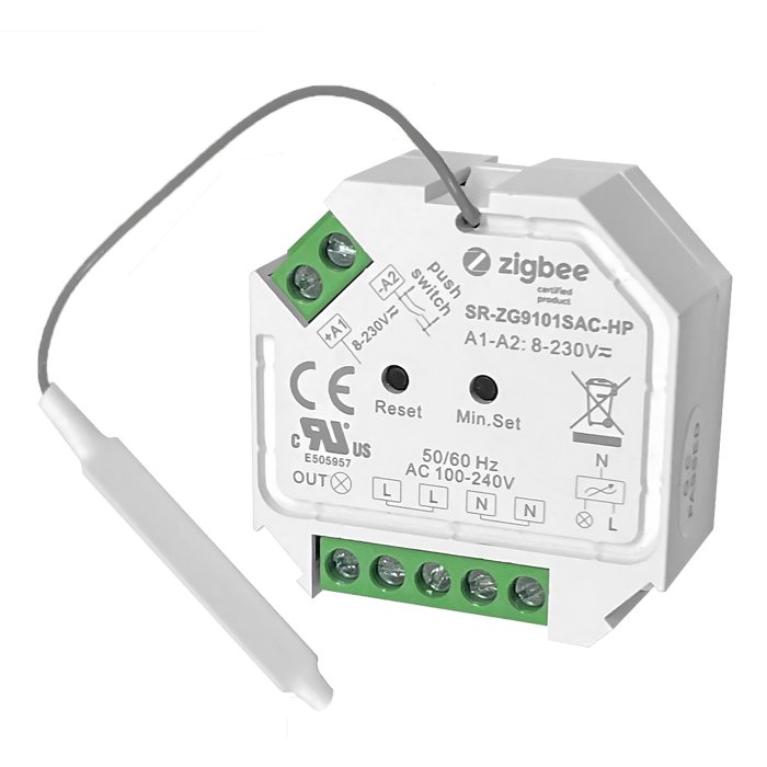 Der ZigBee Dimmer 230V mit der Bezeichnung SR-ZG9101SAC-HP ist ein erstklassiges elektronisches Produkt für das Dimmen von Leuchten, LED-Birnen und weiteren Geräten mithilfe eines ZigBee 3.0 Protokolls. Er ermöglicht den Anschluss herkömmlicher Tastenschalter mithilfe einer PUSH-DIM Stromschiene oder eine Integration in Gebäudeautomationssysteme mithilfe eines ZigBee Protokolls für ein präzises und stufenloses Dimmen von LED-Leuchten, Glühbirnen und weiteren Geräten. Der ZigBee Dimmer 230V SR-ZG9101SAC-HP unterstützt das Trailing Edge Dimming (Phasenabschnittdimmen) und Funktionen wie Mesh Network, Touchlink oder Zigbee Green Power.. Die modernen und fortgeschrittenen elektronischen Elemente ermöglichen zudem das Einstellen einer minimalen Helligkeit der Beleuchtung und eine stufenlose Mikroprozessorsteuerung des Dimmens. Ein Vorteil ist auch seine Miniaturgröße mit der Möglichkeit der Montage in einer Unterputz-Anschlussdose KU68.